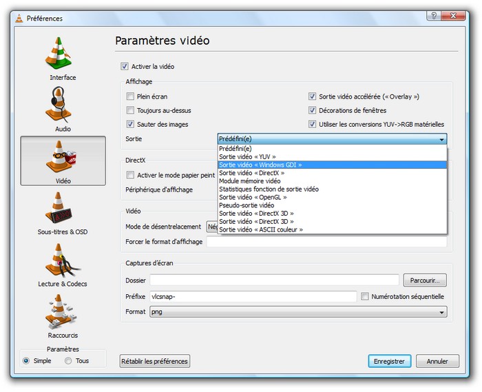 Si vous avez un écran noir et donc, pas de vidéo, clique sur Outils > préfèrence > Onglet “vidéo” cochez “Activer la vidéo” si ce n'est pas fait et configurer à coté de “sortie” en fonction de vos paramètres pc: Windows GDI, OpenGL… par exemple.