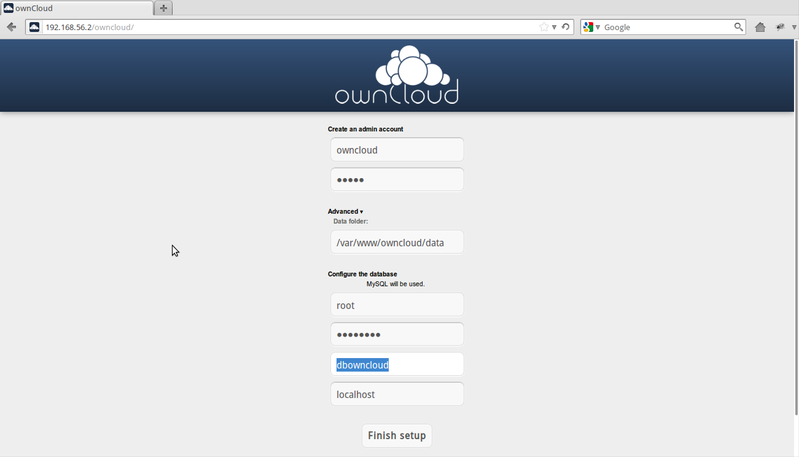 Vous créez votre login et mot de passe puis remplacer l’endroit du stockage par /mnt/owncloud .Choisir MySQL. Puis mettre root, votre mot de passe, owncloud, et localhost. Note pendant l'installation de MySQL il vous a été demander de créer un mot de passe pour ROOT MySQL, il devra être renseigné pour pouvoir créer la base de donnée.