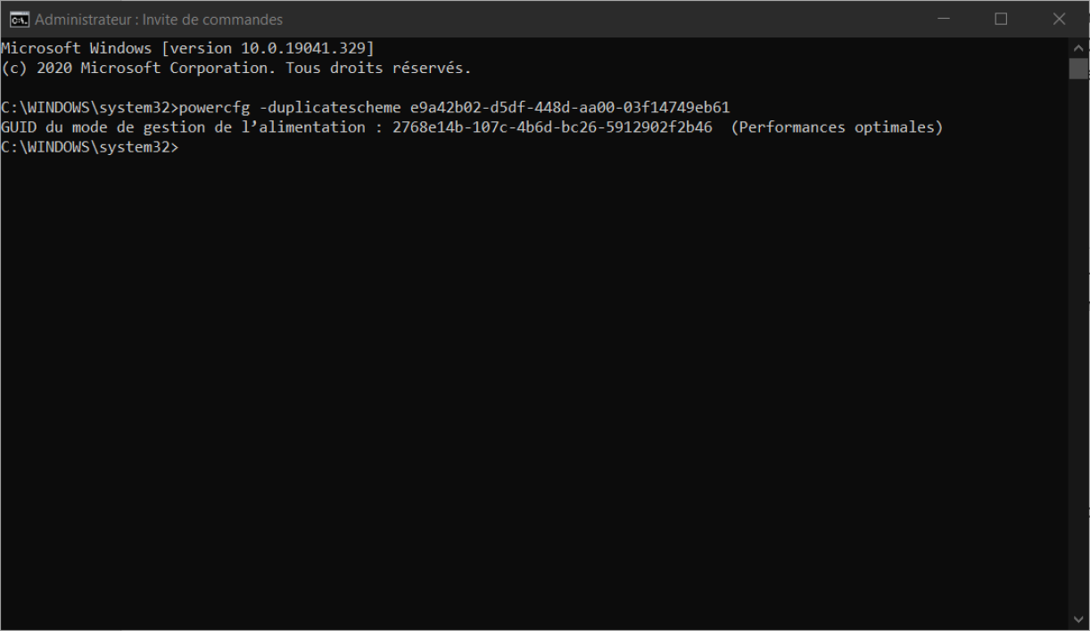 powercfg -duplicatescheme e9a42b02-d5df-448d-aa00-03f14749eb61