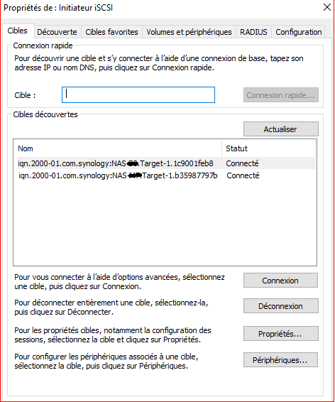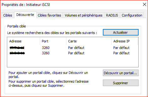 Ouvrir l'initiateur iSCSI sur votre poste windows et ajouter vos LUN