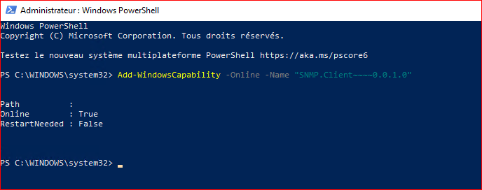 Voici la commande Powershell qui permet d'installer SNMP en ligne: